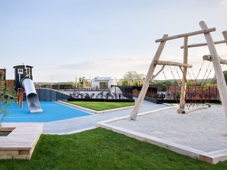 Die optimale Ausnutzung der Flächen auf den Dächern und unter den Gebäuden ist eine konsequente Weiterentwicklung zeitgemäßer Schularchitektur, die auf überteuerte und zu kleine Grundstücke in attraktiver Lage reagieren muss. Denn bei der Grundstücksnutzung durch Schule und Hort sind die Freiflächen genau definiert und in der Ebene oft nicht realisierbar.