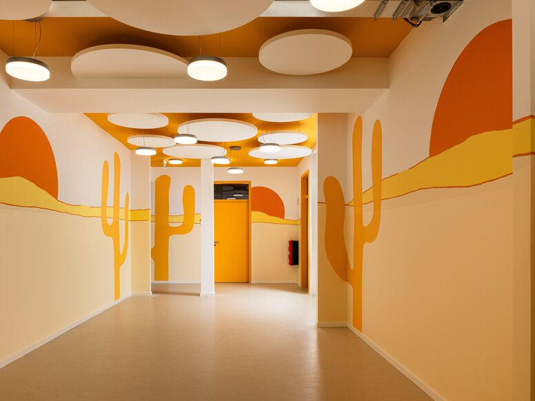 Motive aus „Die unendliche Geschichte“ von Michael Ende, wie hier die Wüstenregion Goab, schmücken die Wände des Schulgebäudes. Um den Kindern eine optimale Orientierung zu ermöglichen, sind diese geschossweise in den jeweiligen Leitfarben gehalten.