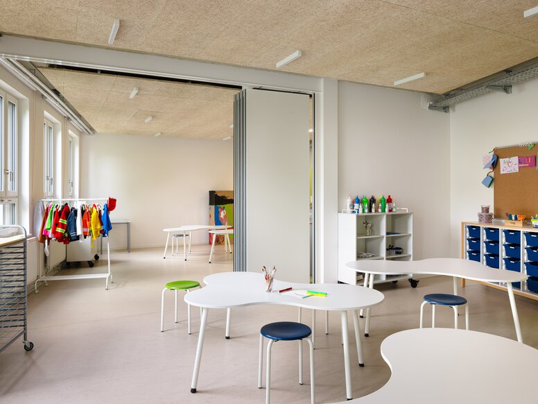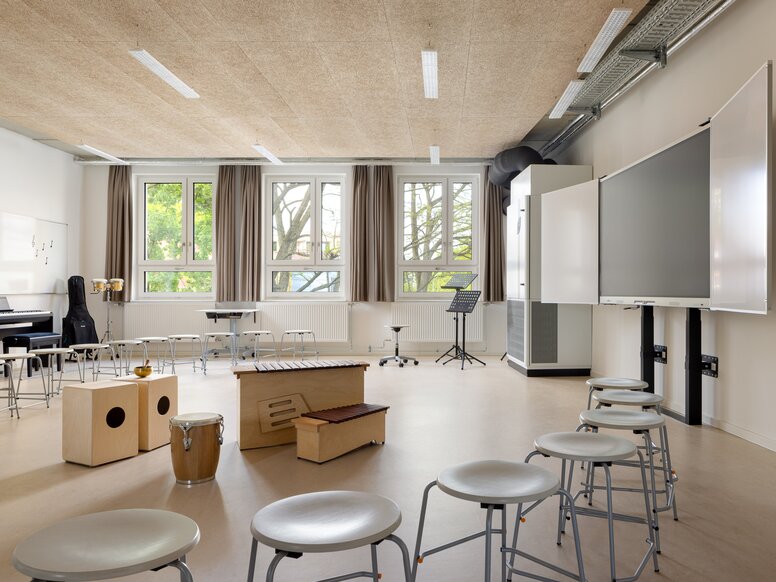 Weiße Wände, naturfarbene Holzwolleplatten an den Decken und ein sandgrauer Linoleumboden sorgen für eine ruhige und konzentrationsfördernde Atmosphäre in den Lernräumen.
