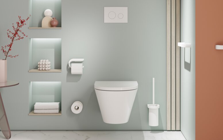 System 800 in der Trendfarbe kombiniert sanfte, organische Formen mit einem schlichten, modernen Design. Die klaren Linien und harmonischen Rundungen verleihen jedem Badezimmer eine elegante Note. Diese Accessoires bieten eine perfekte Mischung aus Ästhetik und Funktionalität und eignen sich hervorragend für eine zeitgemäße und ansprechende Badeinrichtung. Der modulare Aufbau von System 800 ermöglicht dir vielseitige Kombinationsmöglichkeiten, sodass du dein Bad ganz nach individuellen Wünschen gestalten kannst. Die Produktserie umfasst Accessoires für Waschtisch, WC und Dusche sowie barrierefreie Produkte.