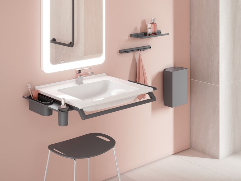Das modulare Waschtischsystem ist die Antwort von HEWI auf den demografischen Wandel. Besonders in Bezug auf Architektur und Produktlösungen gewinnen innovative Konzepte immer mehr an Bedeutung. Mit dem modularen Waschtischsystem ist der Waschtisch über weitere Produkte, die wichtige Zusatzfunktionen bieten, ergänzbar. Das System ermöglicht die Integration eines adaptiven Haltegriffs, der gleichzeitig als Handtuchhalter dient sowie eines modularen Ablagesystems direkt am Waschtisch. So ist gewährleistet, dass alle Badutensilien in greifbarer Nähe ihren Platz finden.