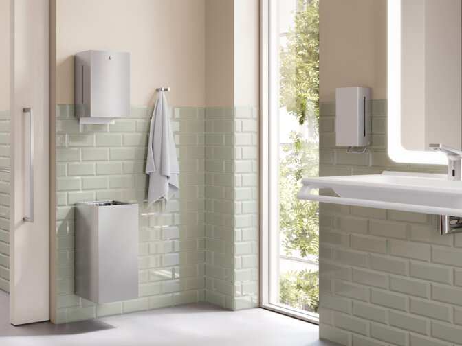 Von Seifen- und Papierhandtuchspendern über Hygienekombinationen bis hin zu Abfallbehältern in verschiedenen Größen bietet HEWI ein durchgängiges, funktionales Sortiment, das höchste Designansprüche mit langlebiger Qualität verbindet.