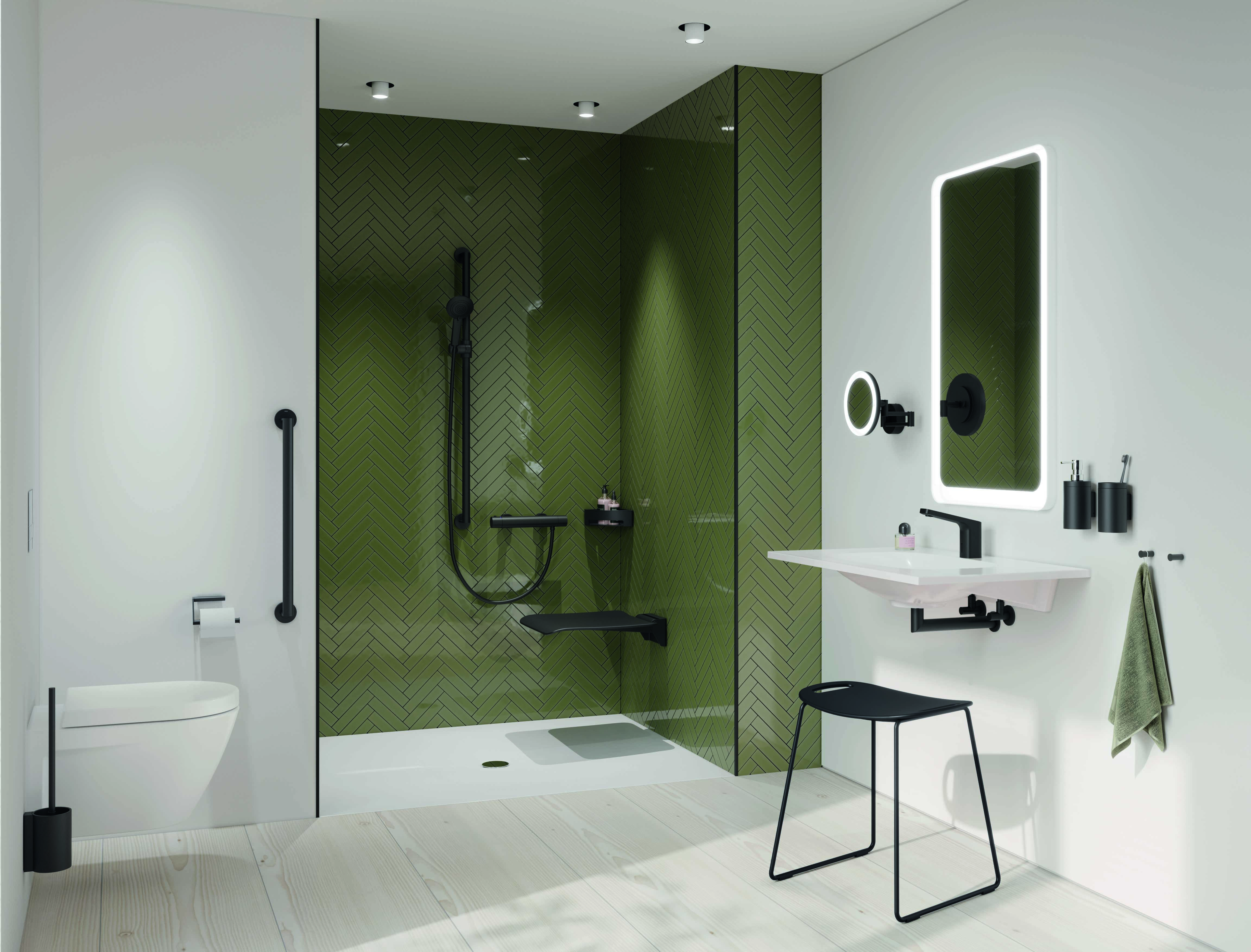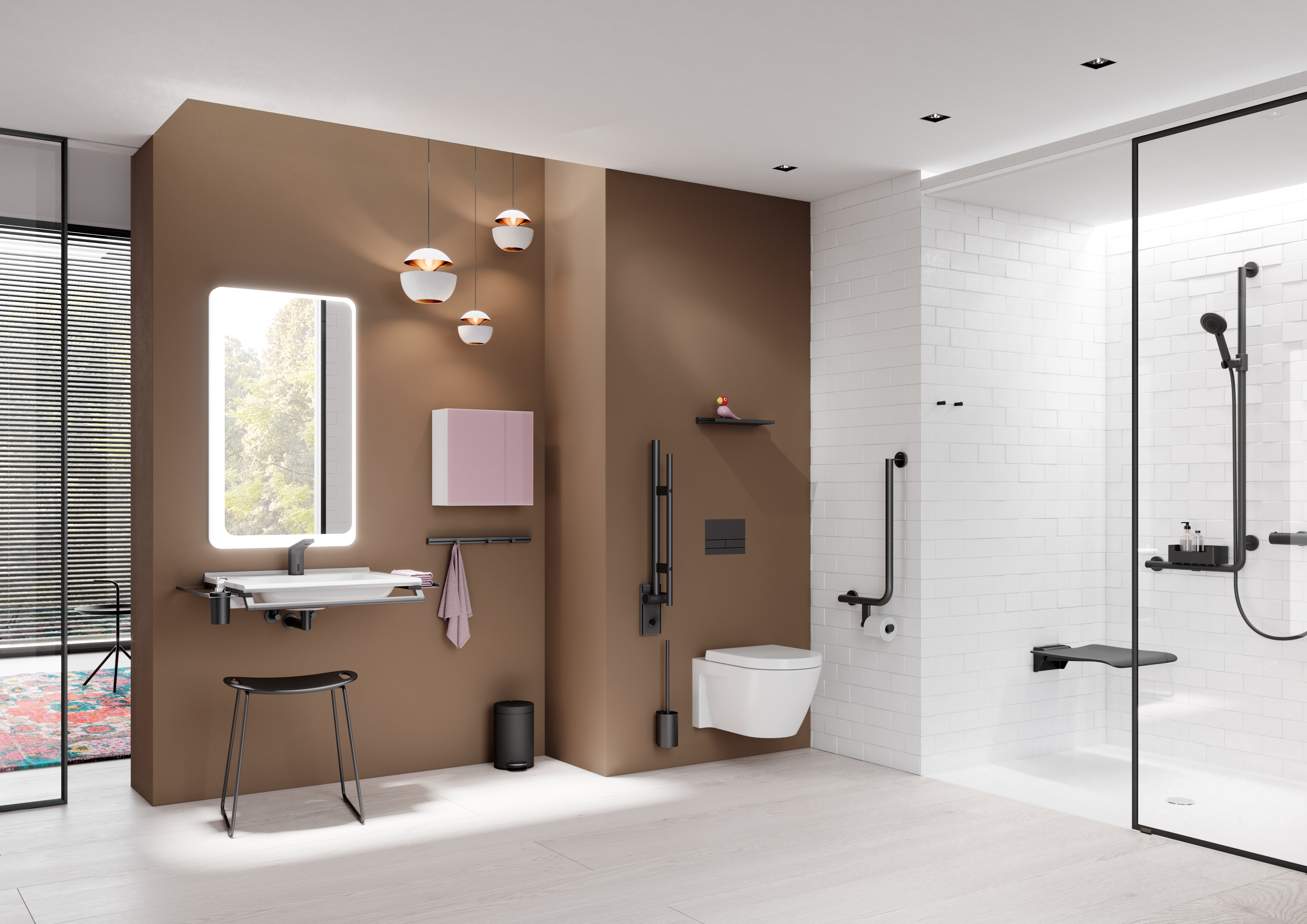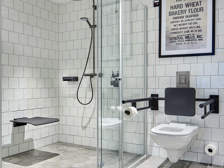 Die Sitzfamilie in Schwarz matt von HEWI eröffnet den Raum für Gestaltungsvielfalt und bietet erhöhten Komfort und Sicherheit im Sanitärraum.