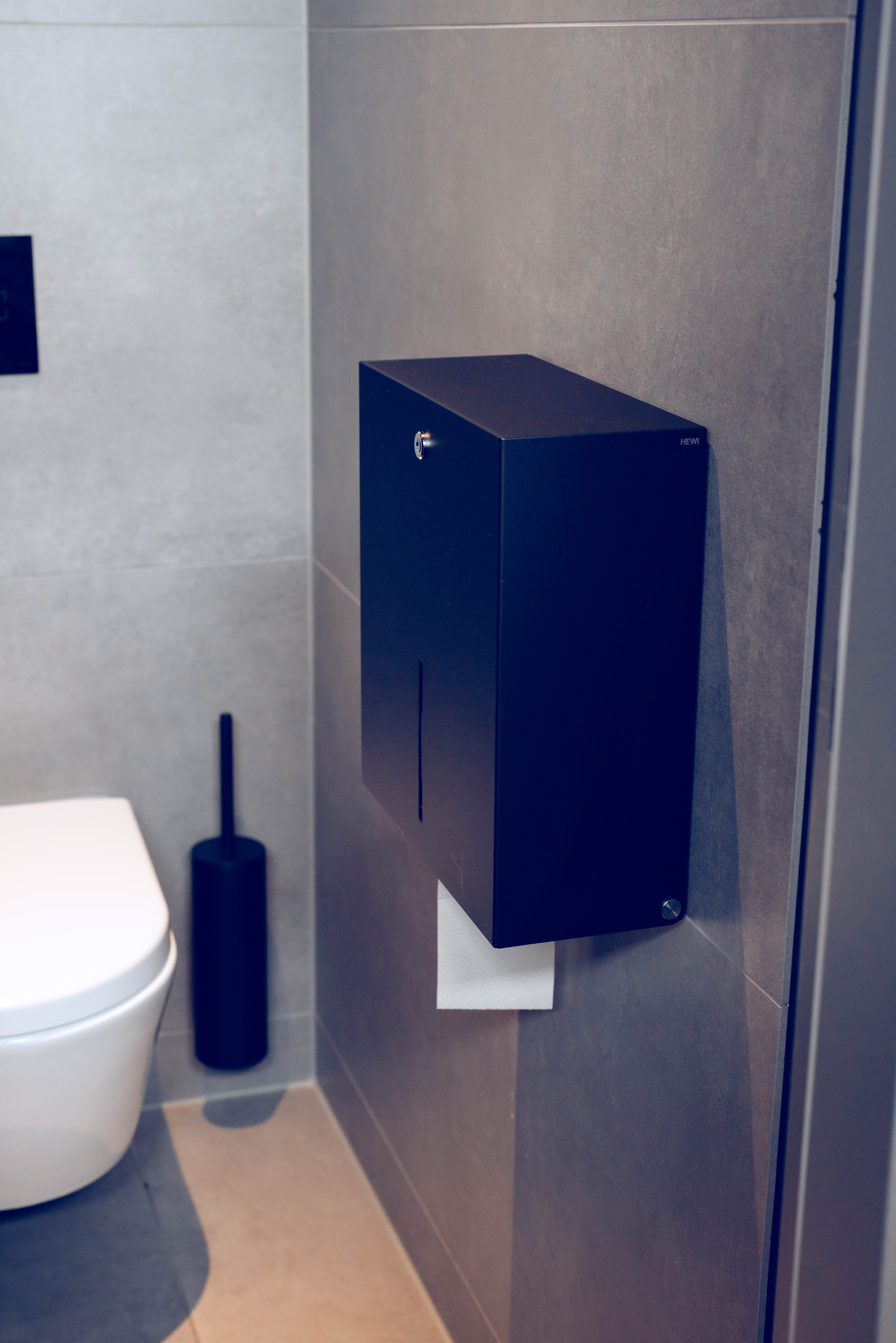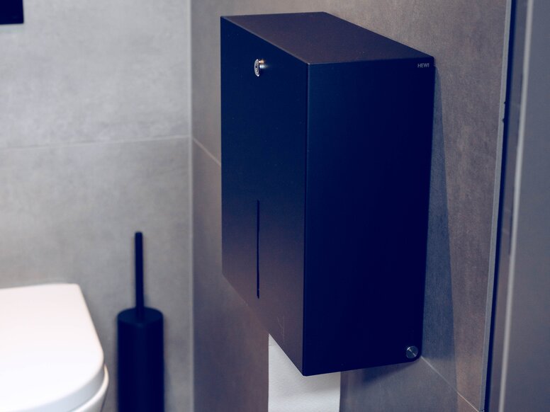 System 900 von HEWI ermöglicht im Restaurant Margaretental ein stimmiges Gesamtkonzept in Schwarz matt vom Papierrollenspender bis hin zur WC-Bürstengarnitur.