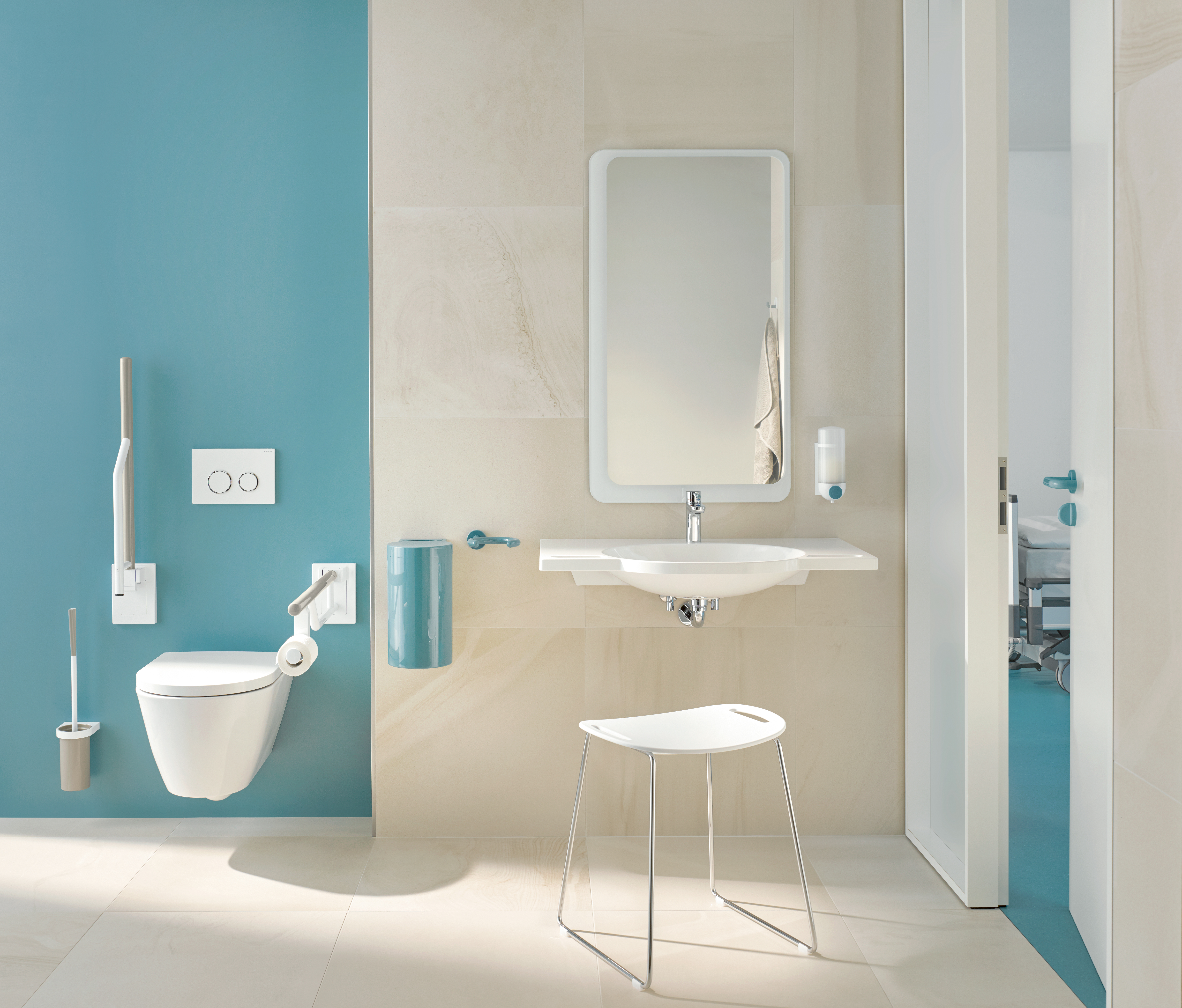 Clevere Lösungen machen die Produkte leicht bedienbar. So ist beispielsweise beim Seifenspender die Drucktaste zum Dosieren der Seife durch einen farbigen Kontrast deutlich hervorgehoben. Die leicht angeraute Oberfläche des Druckknopfes macht das Funktionselement zudem ertastbar. Die Funktionselemente können auf Wunsch farbig gestaltet werden. Der gezielte Einsatz von kontrastreichen Farben prägt das System aus Polyamid – hierdurch wird die Orientierung erleichtert und eine intuitive Nutzung möglich. Aufgrund des Materials eignet sich System 800 K besonders für den Care-Bereich. Die porenfreie Oberfläche ist leicht zu reinigen und weist eine angenehme Haptik auf. Aufgrund der Modularität der Produkte ist eine Ausstattung des Sanitärraumes, angefangen mit klassischen Accessoires, über Komfortprodukte, bis zu Produkten für barrierefrei gestaltete Bereiche möglich. Das Sanitärsystem 800 K kann mit passenden Baubeschlagprodukten von System 111 kombiniert werden. Hierdurch ist eine durchgängige Lösung von der Eingangstür bis in den Sanitärraum möglich. Ergänzt wird System 800 K durch hochwertige Polyamidhandläufe von System color.