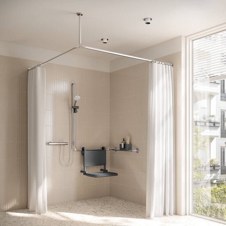 Sicheres Halten ist im Bad unerlässlich. Für die Sicherheit im Bad ist es hilfreich, ausreichend Stützklappgriffe und/oder Haltegriffe einzuplanen. Diese vereinfachen das Aufstehen und Hinsetzen. Noch dazu ermöglicht das Rundrohrdesign von WARM TOUCH ein symmetrisches Greifen. Nutzende empfinden die ergonomische Form und warme Haptik als angenehm – besonders bei Kälteempfindlichkeit.