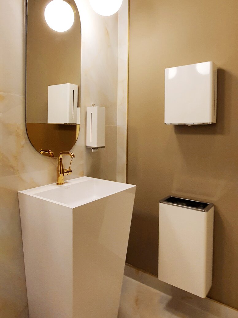 HEWI Spendersysteme der Serie 950 komplettieren die Sanitärausstattung im Abram Gurewicz´s Guesthouse. Ästhetische Spendersysteme und Abfallbehälter aus hochwertigem Edelstahl harmonieren mit den barrierefreien Sanitärlösungen.