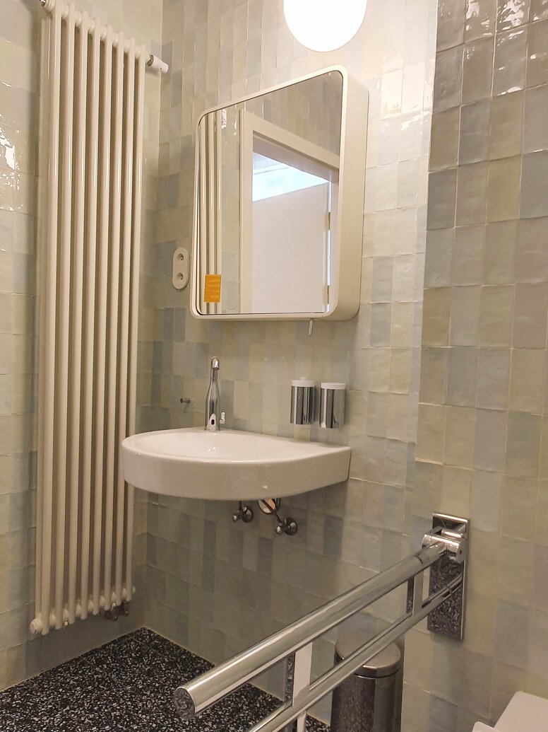 System 900 erfüllt die Anforderungen verschiedenster Anwendergruppen in Gesundheitsbauten – sei es im target="_blank">Krankenhaus oder der target="_blank">Seniorenresidenz. Durch die Oberflächen-Variante Edelstahl setzt System 900 Akzente im Bad des Abram Gurewicz´s Guesthouse und schafft barrierefreie Sanitärräume mit Hotelkomfort.