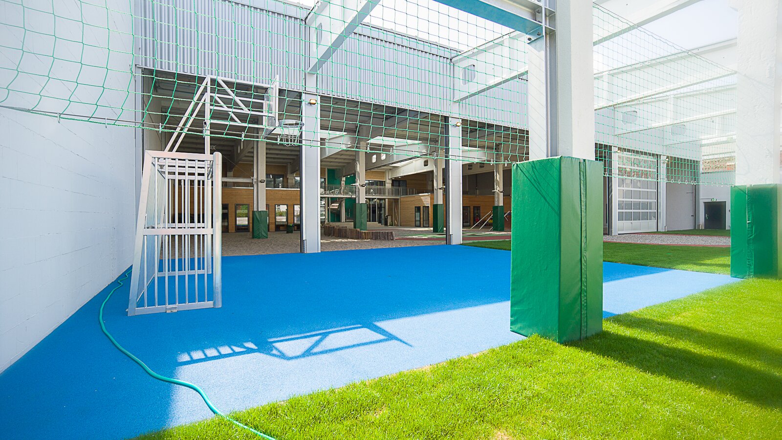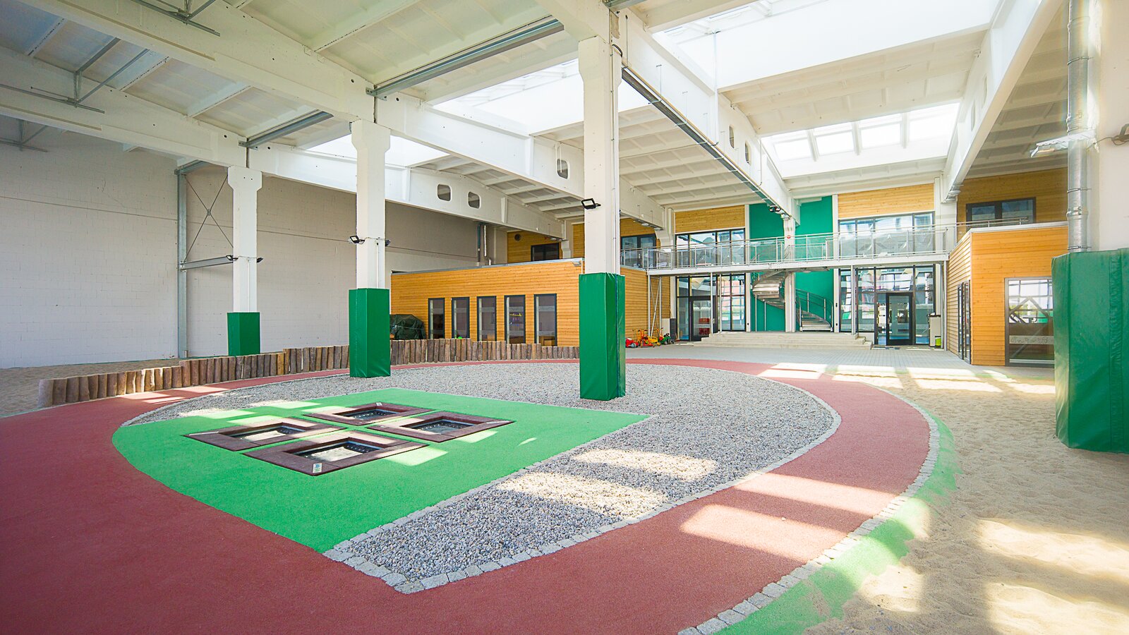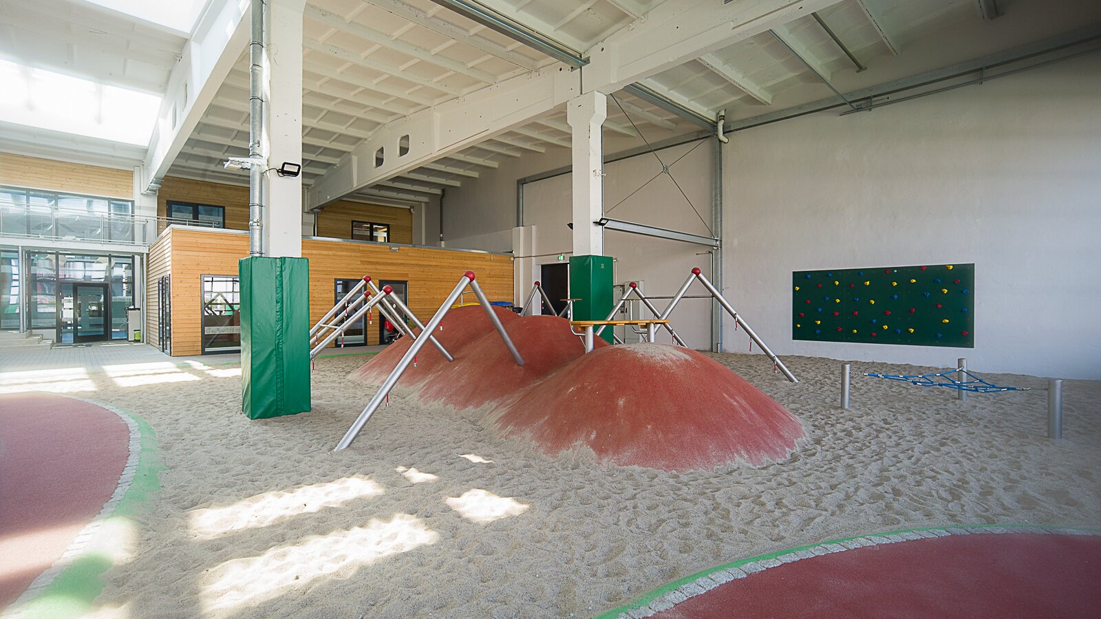 Die restlichen zwei Drittel der Gesamtfläche beansprucht die überdachte Spielhalle, die mithilfe von sechs öffenbaren Rolltoren mit dem Außenbereich verbunden ist. Im Indoor-Spielbereich gibt es viele Spiel- und Bewegungsmöglichkeiten für die Kleinen: Trampoline, Kletterwand, Sandspielplatz mit Klettergerüst in Spinnenform und eine achtförmige Roller-Fahrbahn. Bei geöffneten Toren ist der Übergang zum Außenbereich fließend und die Kinder können die Naturrasenfläche und den Multifunktionsplatz für verschiedene Sportarten wie Handball, Fußball oder Basketball nutzen.
