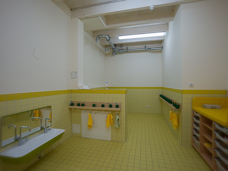 Speziell für kleine Nutzer hat HEWI Waschtische und Spiegel entwickelt, die den Anforderungen an Produktlösungen in Kindergärten und Grundschulen entsprechen. Das Waschtischsortiment umfasst Einzel- und Doppelwaschtische sowie eine Variante mit integrierten Griffmulden. In der KITA in der Kammgarnspinnerei macht die zweifarbige Variante mit fröhlichem Apfelgrün die Kinder glücklich.