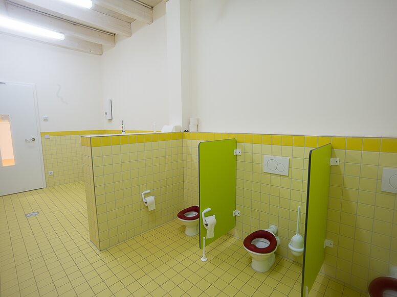 Das Sortiment der Lösungen in der KITA in der Kammgarnspinnerei umfasst Waschtische, Spiegel, Armaturen, Zahnputzbecherleisten und Accessoires wie Seifenspender oder WC-Papierrollen-Halter. In der KITA in der Kammgarnspinnerei unterstützen außerdem barrierefreie Ausstattungslösungen in den Sanitärräumen die Kinder bei der Nutzung.