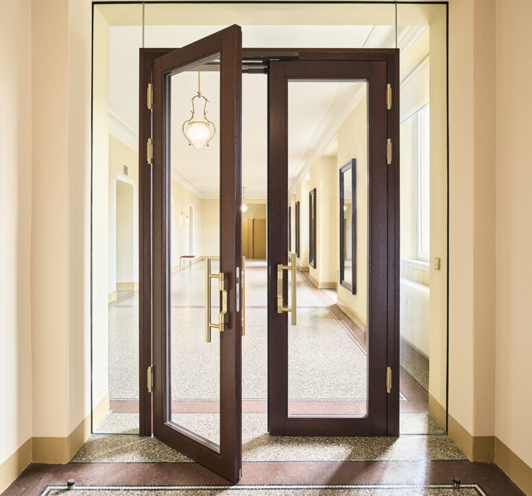 Für beide Türtypen suchten die Planenden nach einer passenden vertikalen Griffstange in Messingoptik, da solche auch an den historischen Türen verwendet wurden. Die Verwendung von heutzutage typischerweise horizontalen Drückerstangen war nicht zu vereinbaren mit den denkmalpflegerischen Ansprüchen. Dennoch mussten die neuen Brandschutztüren die Funktion als Flucht- und Rettungsweg gewährleisten. Fündig wurden die Planenden bei HEWI und der Drückergriffgarnitur aus dem System 162.