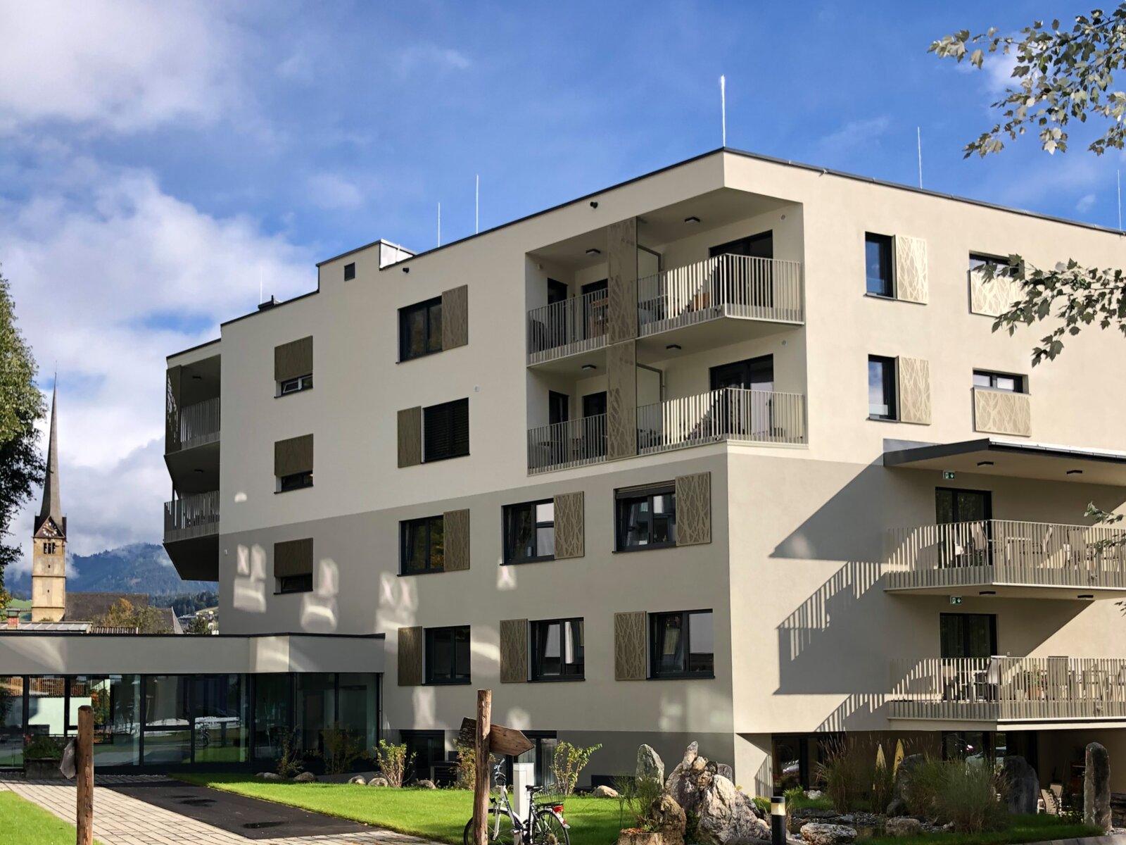 The accessible spaces vary between living areas of 46 to 64 square metres. Each residential unit offers a modern kitchen and is designed to be accessible. In total, the retirement home now offers a living space of 1116 square metres. The concept of sustainable energy generation, which was already introduced in the first building, is continued in the new building with a photovoltaic system on the roof.