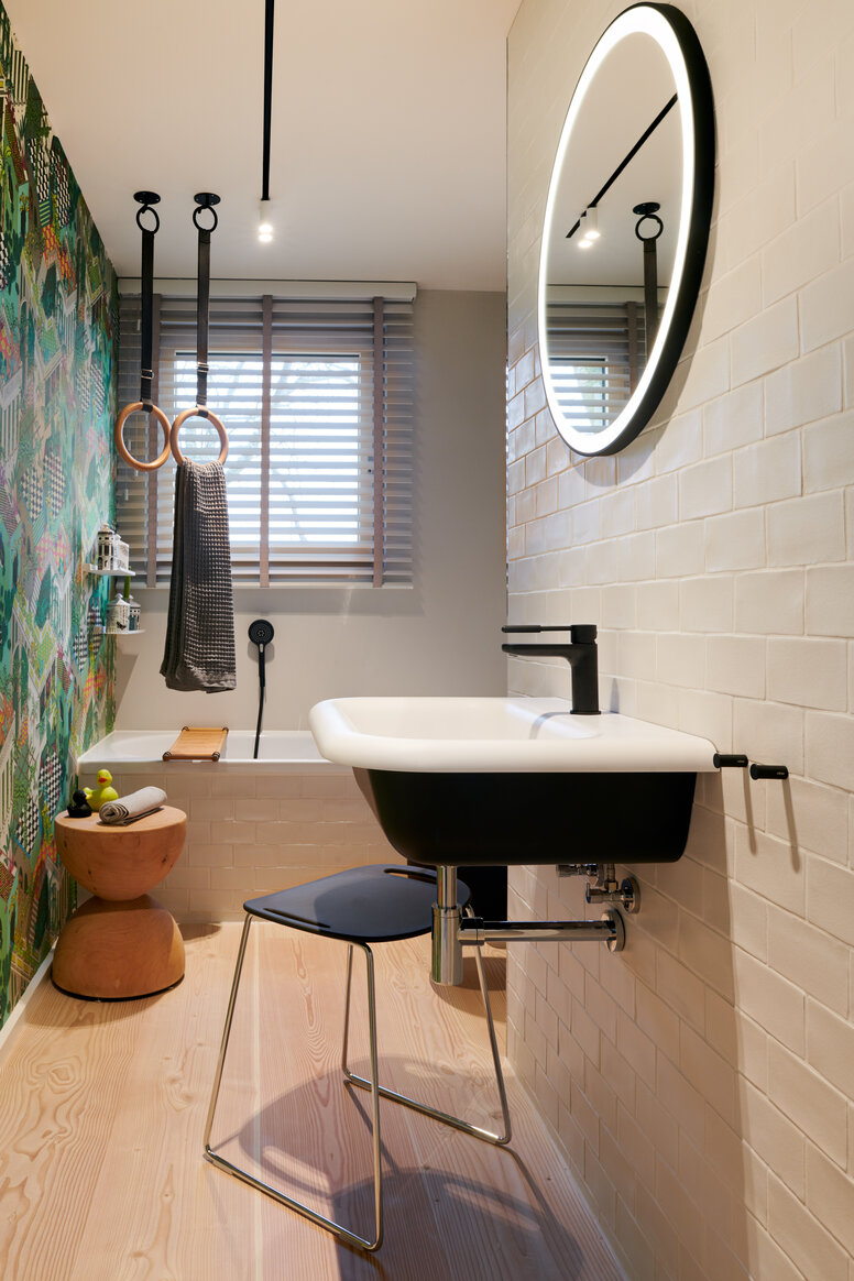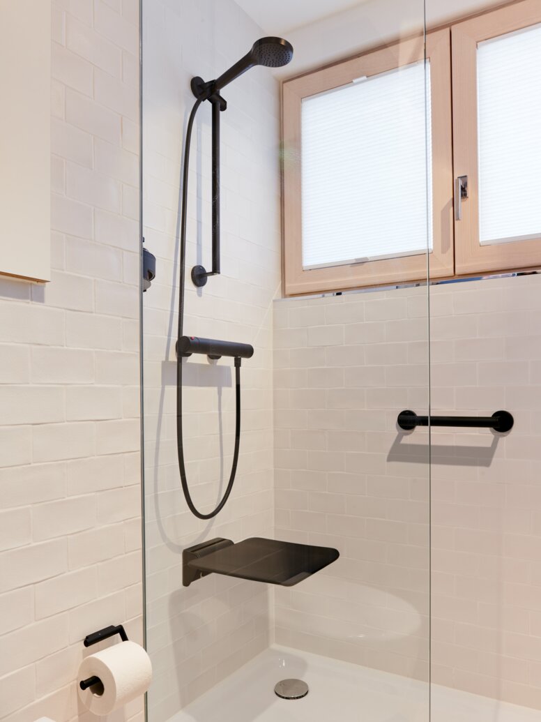 The redesign of the apartment was based on the universal design concept. The bathrooms were fitted with Italian Metro tiles, a bathtub and shower from Kaldewei as well as accessories and comfort products from the System 900 design line in matt black from HEWI.