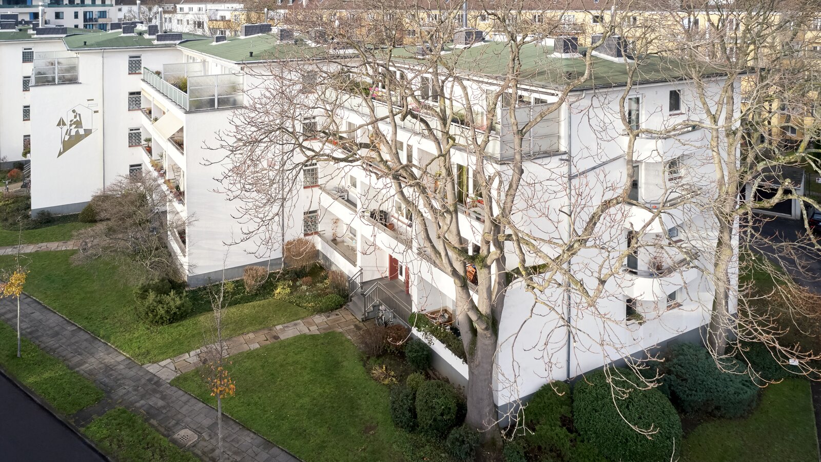 The buildings are set at an angle and angled towards each other. With the unusual arrangement of the houses in the 1950s, the planners achieved better lighting and sunlight for the individual apartments, as well as mitigating the westerly winds. At the same time, the design emphasises the individual character of the living space.
