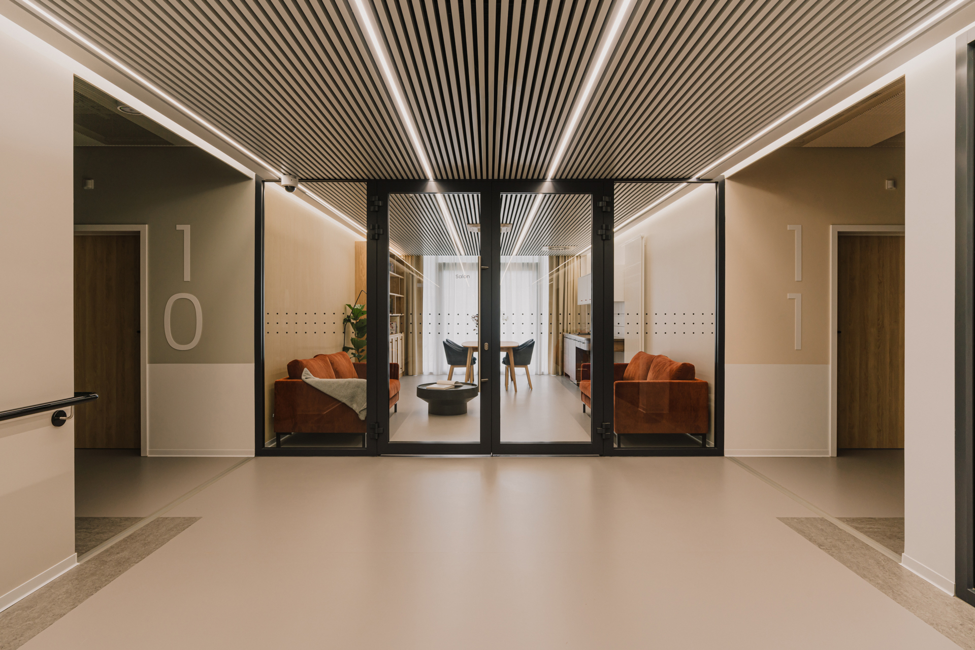 In Poland, centres for senior citizens or care facilities are often outdated and poorly equipped. The young architectural office Zawieja Studio from Poznań impressively demonstrates that it doesn’t have to be this way. It addressed the question of how design and interior architecture can positively influence the well-being and orientation of the elderly and people in need of care. The result is an innovative spatial concept and visual guidance systems that have a beneficial effect on body, mind and soul and always focus on the needs of the patients. In addition to the requirements for barrier-free usability, psychological and social aspects were taken into account in the realisation of the project.