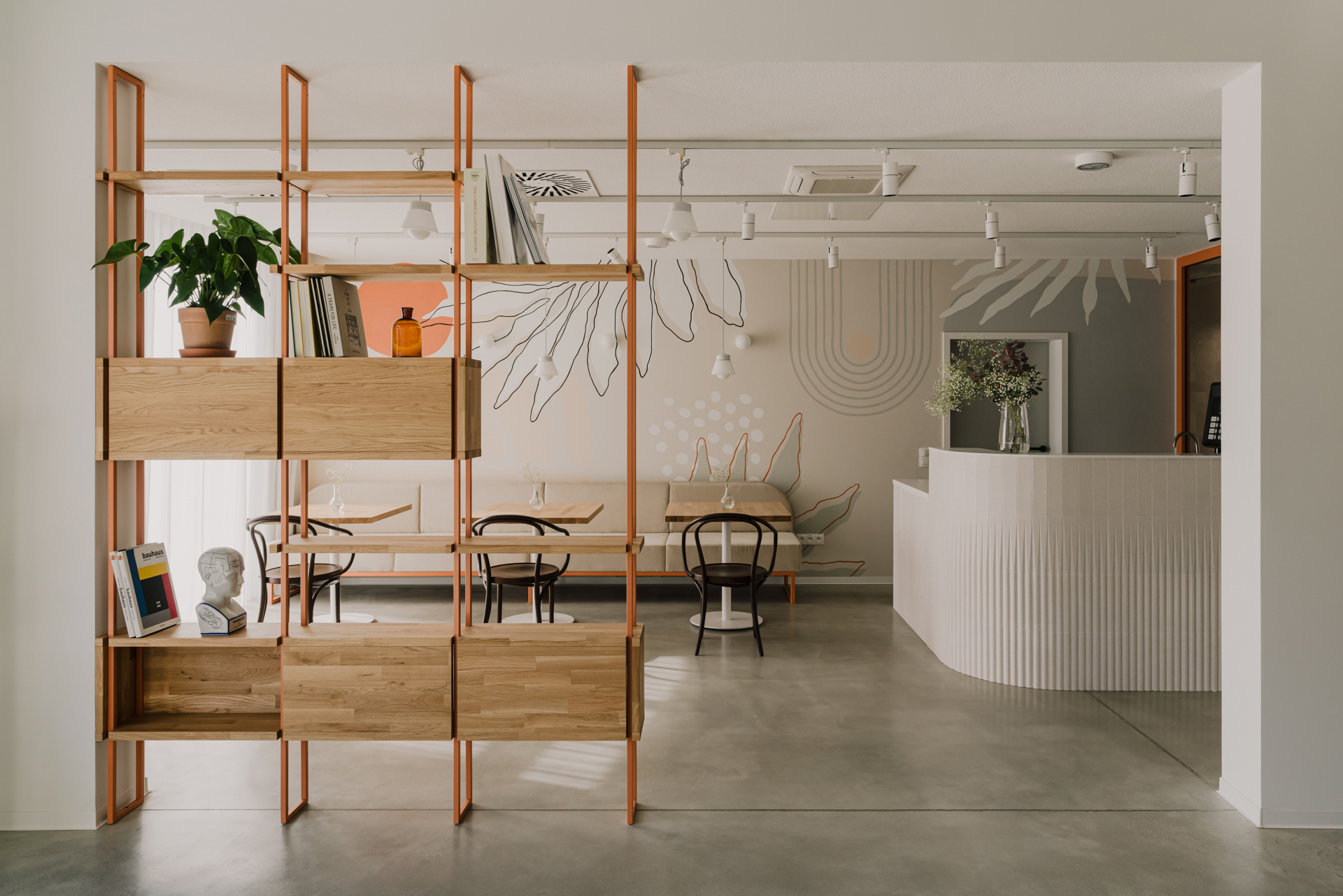 The colour concept of the interiors is inspired by the surrounding nature: Warm earth tones are reflected in the furniture and building hardware. Paintings with motifs from the plant world and seascape decorate the café, dining room and conservatory, while graphic ornaments on various walls also establish a direct floral connection.