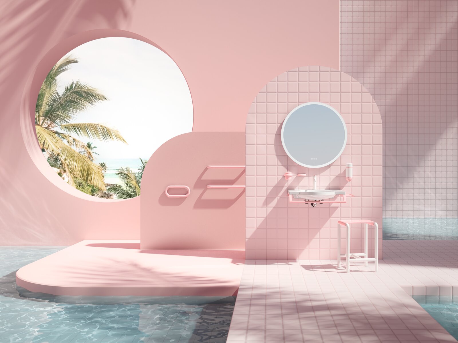 The collection’s products meet the highest standards of quality, durability, and functionality. The color range spans elegant pale pink to chic combinations of pale pink, white, and black, offering versatile design possibilities for any bathroom.