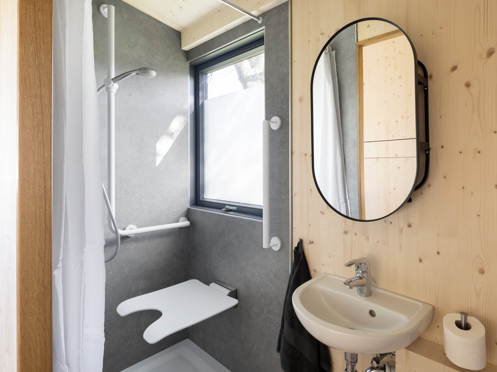 Christian Bock : Nous avons fait le tour du marché et examiné les options qui s'offraient à nous pour équiper la salle de bains. Les produits devaient s'harmoniser avec le reste de l'apparence de la maison. En tant que menuisier du nord de la Hesse, nous connaissons bien sûr HEWI. Nous avons cherché quelque chose de simple et de moderne et avons trouvé chez ce que nous voulions avec le système 900 de HEWI. Finalement, le choix s'est porté sur la couleur blanc mat, qui s'accorde parfaitement avec le reste de l'intérieur de la tiny house. Le plus important dans le choix était que M. Conrad soit satisfait des produits. Et c'est définitivement le cas.