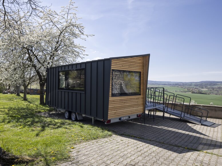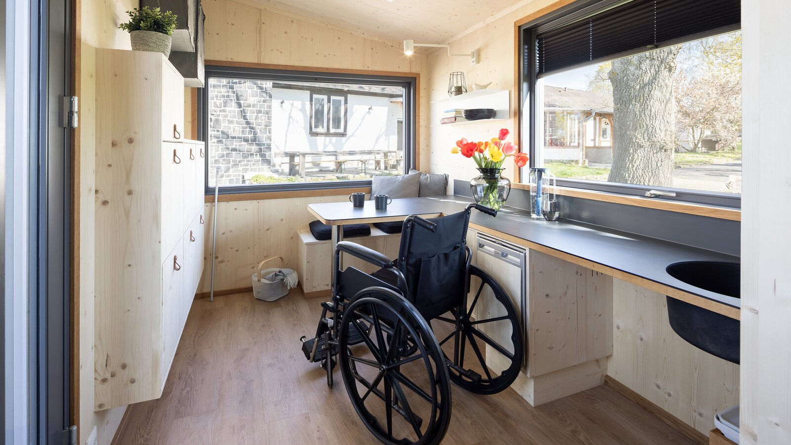 Christian Bock : Pour nous, il était particulièrement important que la Tiny Rolli House soit certes accessible en fauteuil roulant, mais qu'elle conserve néanmoins le charme d'une tiny house. Elle ne doit en aucun cas faire penser à une « maison de repos » ou à un « hôpital ». En même temps, il devait y avoir des fonctions importantes pour que Monsieur Conrad puisse se déplacer de manière autonome dans la tiny house. Il s'agissait par exemple de barres d'appui ou d'un siège de douche dans la salle de bains. Nous ne voulions toutefois pas mettre l'accent sur ses déficits, mais l'aider au mieux. La Tiny Rolli House doit avoir une influence positive sur ses habitants. L'apparence et le design ne doivent pas être négligés. Une particularité de cette maison est certainement la rampe qui permet aux personnes en fauteuil roulant d'accéder confortablement à la tiny house. Pour assurer une bonne adhérence des pneus, nous avons posé un revêtement de sol design. Un réfrigérateur extractible, une table chauffée adaptée à un fauteuil roulant ainsi qu'un évier et une plaque de cuisson à portée de main assurent le confort d'habitation souhaité. La petite surface s'est même avérée être un avantage pour M. Conrad : Il dispose des choses les plus importantes dans un espace restreint, il n'a qu'à se retourner. Depuis son lit, il peut se hisser directement sur les toilettes sans utiliser son fauteuil roulant.