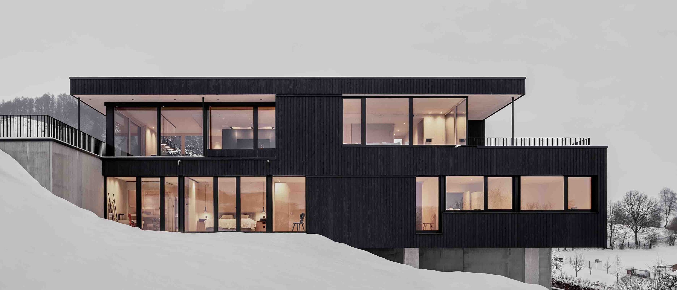 Le terrain se situe à la transition entre une structure villageoise développée et un paysage ouvert. Le terrain monte en pente raide, ce qui crée un composant aussi complexe qu’inspirant. Au lieu de niveler le terrain, l’architecture réagit à la topographie existante : deux étages massifs en béton apparent forment le socle et absorbent les différences de hauteur, abritent les espaces de desserte et fonctionnels et transmettent, par leur présence introvertie, un sentiment d’attachement à la terre et de calme. Sur cette base viennent se poser deux étages tout en légèreté construits en bois massif contreplaqué (BSP/CLT) qui s’ouvrent sur l’environnement. « Il ne s’agit pas d’opposer quelque chose au paysage, mais d’absorber sa force », explique Florian Schönauer. Il en résulte un échelonnement clair de l’espace : le bas, discret et protégé, le haut, ouvert, lumineux et offrant une vue panoramique.