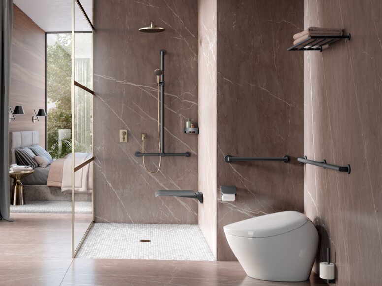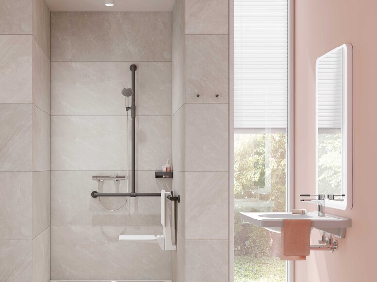 Avec les sièges de douche, les tabourets, les barres de maintien, les crochets ou les systèmes de coulisseaux de douche, les thermostats, les rideaux de douche et les tablettes de douche, vous équipez les douches de manière à les rendre accessibles aux personnes handicapées et vous rendez la douche plus confortable pour vos clients et clientes.