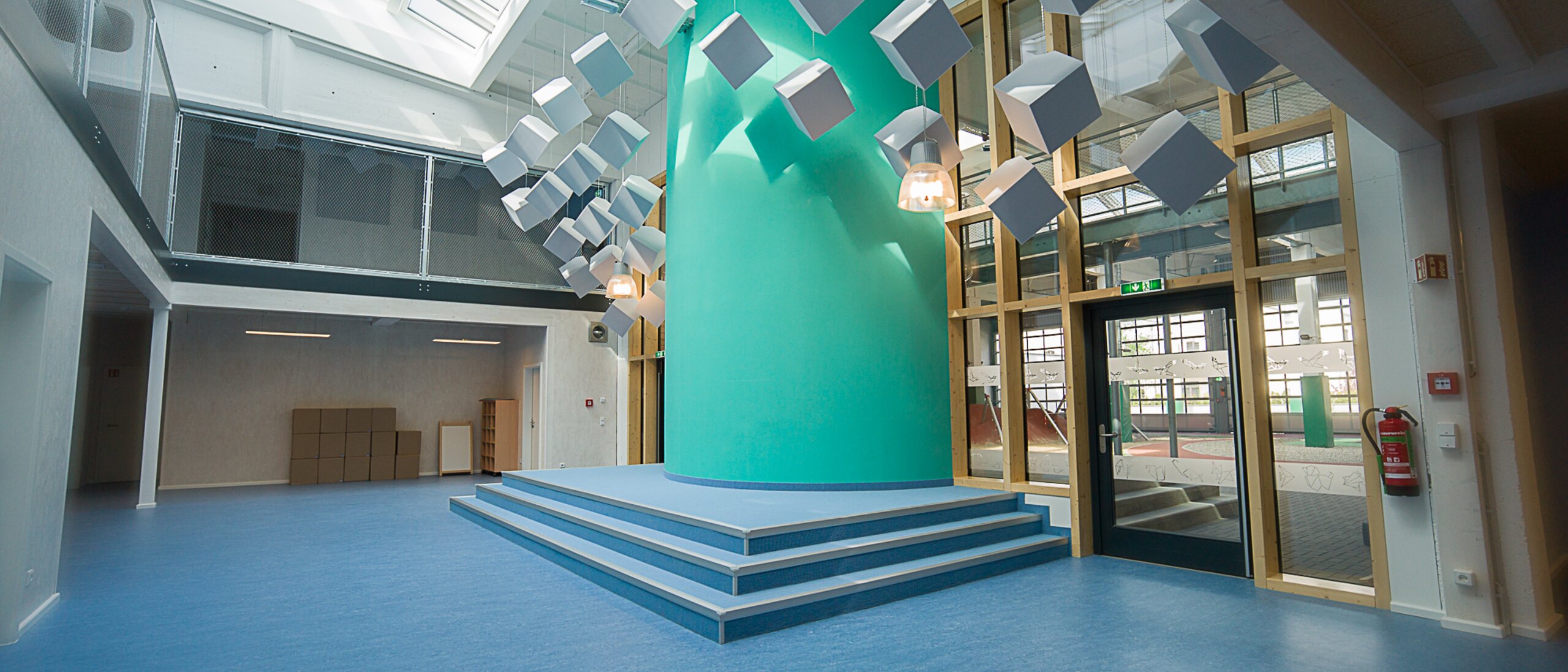 In de voormalige productiehal wordt een derde van de oppervlakte in beslag genomen door het binnen gebouwde huis. Hier vindt u de verschillende aan de leeftijd aangepaste kamers, evenals de sanitaire voorzieningen. Op de benedenverdieping bevinden zich de crèche en de kleuterschool, alsmede de eetzaal, die tevens dienst doet als multifunctionele zaal. Op de eerste verdieping bevinden zich, naast de crèche, de kamers voor het personeel en de gebouwendienst en de administratie, ook functionele en speelruimten die door alle kinderen van het kinderdagverblijf worden gebruikt.